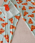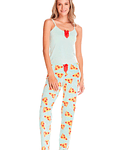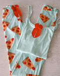 Linda y suave pijama de blusa verde menta con tiras delagadas y moño en cinta, pantalón verde menta con hermoso diseño de pizzas acompañado de un moño en cinta