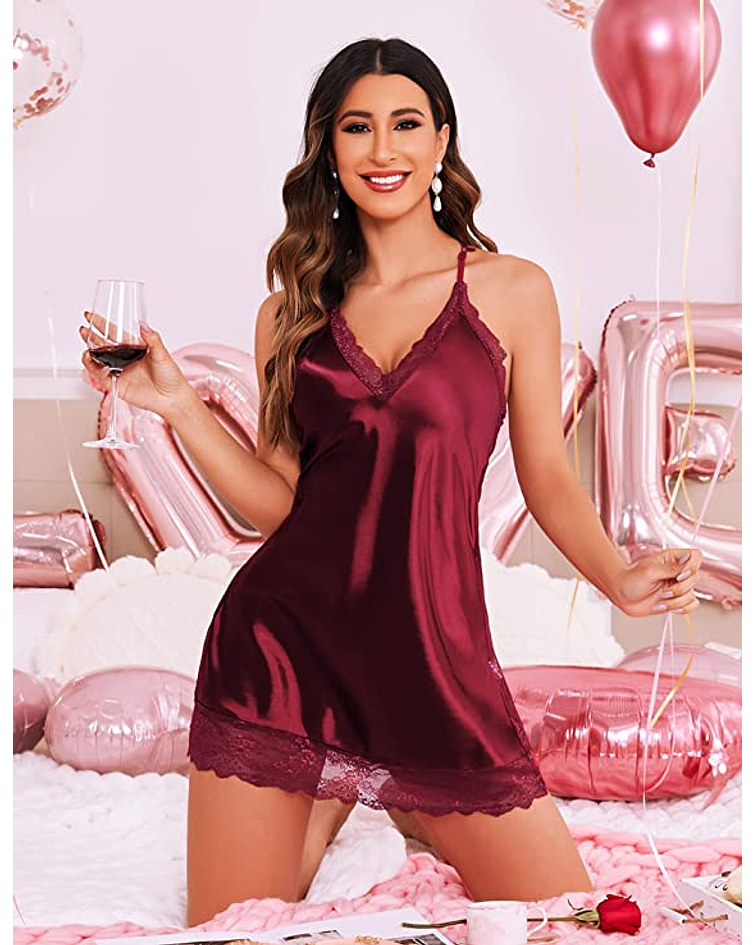 Diseño de satín color vino con encaje en laterales, parte superior y parte inferior, con delicado escote en la espalda.