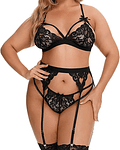 Sujetador de encaje floral con diseño bajo triangular acompañado de dos tirantes que te permitirán definir y resaltar tu busto, cuenta con correas ajustables. Panty tiro medio en encaje floral. liguero en encaje floral acompañado de diseño en corazones y correas ajustables.