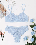 Elixir Azul hermoso set de dos piezas. Sujetador en encaje floral acompañado de diseño en transparencia, posee varilla para mejor realce y correas ajustables. panty tiro alto en encaje floral con diseño en transparencia que resaltara tu cintura y cadera apropiado para seducir tu pareja.