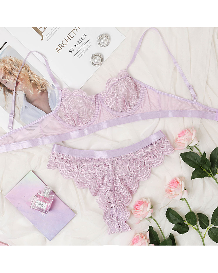 Elixir Lila hermoso set de dos piezas. Sujetador en encaje floral acompañado de diseño en transparencia, posee varilla para mejor realce y correas ajustables. panty tiro alto en encaje floral con diseño en transparencia que resaltara tu cintura y cadera apropiado para seducir tu pareja.